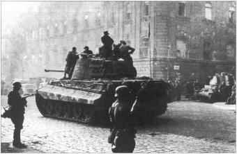 слабее аналогичных при отражении танковых ударов немцев под Курском.Бронетанковая техника на улицах Будапешта: немецкий "Тигр II" из 503-го тяжелого танкового батальона проезжает мимо позиции венгерской зенитной САУ 40М "Нимрод". 16 октября 1944 г. [А] Armored vehicles in the streets of Budapest: a German Tiger II from the 503rd Heavy Panzer Battalion moves along past the position of a Hungarian 40mm Nimrod Model 1940 SPAA gun. 16 October 1944. (A)